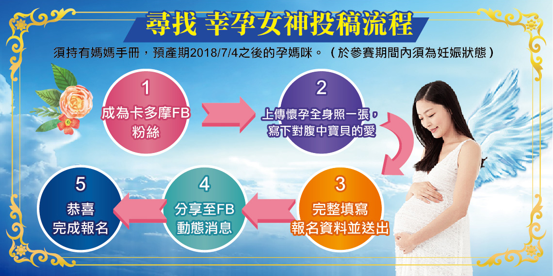 參加資格:須持有媽媽手冊,預產期2018/7/4之後的懷孕中媽咪(於參賽期間內須為妊娠狀態)